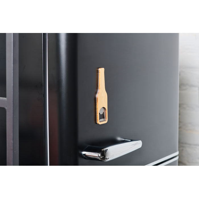 Magnetyczny otwieracz do butelek ze stali nierdzewnej z bambusową powierzchnią.