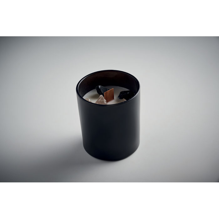 - Roślinna świeca woskowa o zapachu wanilii w szkle z kamykami i z drewnianym knotem.